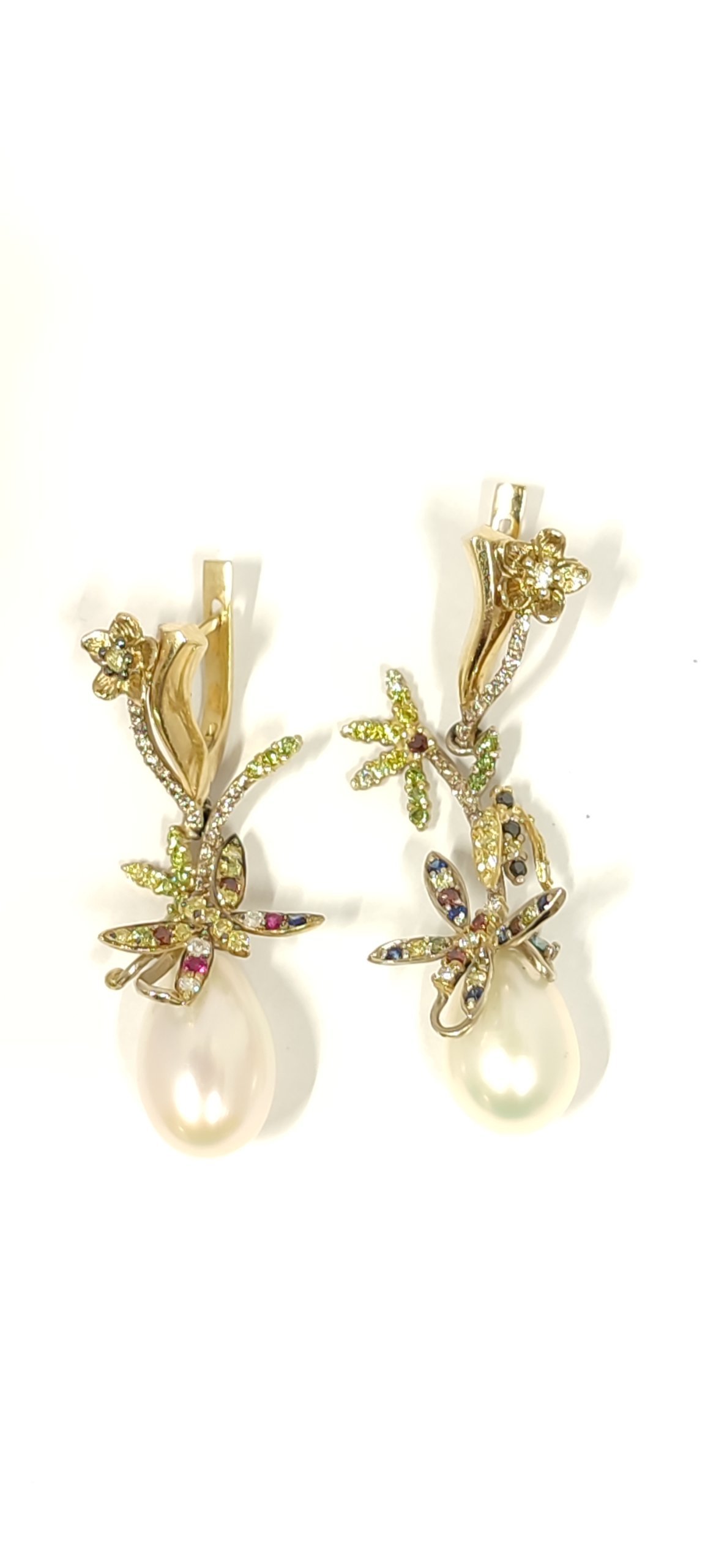 Aukso spalva – balta, gelsva. Aukso praba – 585. Auskarų svoris – 9,33gr. Spalvoti deimantai. Perlai