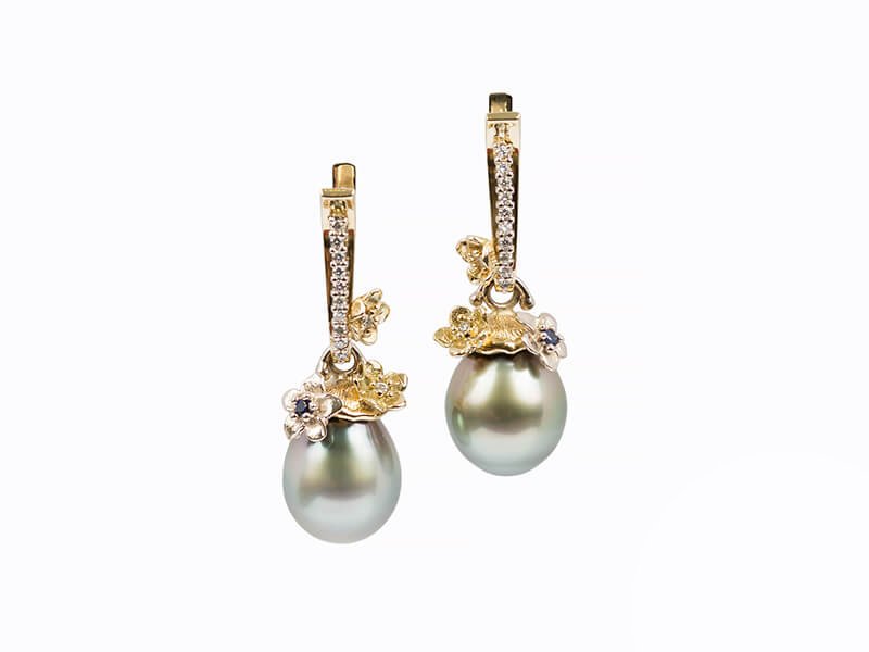 Tik pagal užsakymą.  Auskarai 750 prabos aukso 11,53gr.  Metalo spalva – baltas, geltonas auksas.  Lašo formos perlai. Briliantai 0,26ct.RW VS. Safyrai 0,03ct. Užsakymo metu galimas kitos aukso spalvos, prabos ar kitų brangakmenių, perlų pasirinkimas. Gaminiai prabuojami ir sertifikuojami. Pagaminimo terminas – iki 4 savaičių.