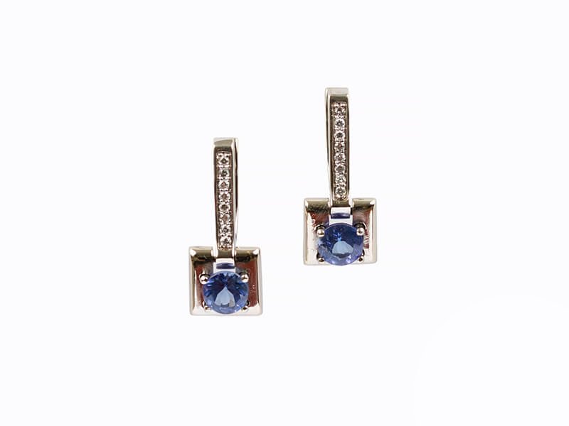 Tik pagal užsakymą. Auskarai 585 praba 4,5 gr. Baltas auksas. Brangakmeniai: Tanzanitai 1ct. Briliantai 0,16ct.RW VS. Užsakymo metu galimas aukso spalvos, aukso prabos ar brangakmenių pasirinkimas. Gaminys prabuojamas ir sertifikuojamas. Gamybos terminas – 2-3 savaitės.