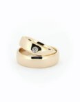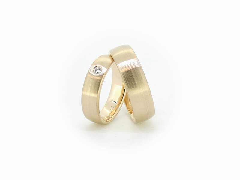 Pavyzdyje – rausvo 585 prabos aukso vestuviniai žiedai. Matinis paviršius. Lengvai gaubto profilio. Moteriškas žiedas su briliantu 0,06ct. RW VS. Žiedų plotis – 5-6mm. Žiedų svoris 12,5gr.