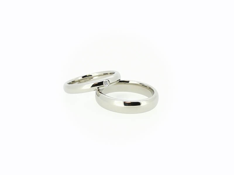 Pavyzdyje  – balto  585 prabos blizgaus aukso vestuviniai žiedai. Moteriškas žiedas su briliantu 0,05ct. RW WS. Žiedų plotis – 4- 5mm. Žiedai gaubto profilio su gaubimu viduje (comfort fit). Žiedų svoris – 10,5gr.