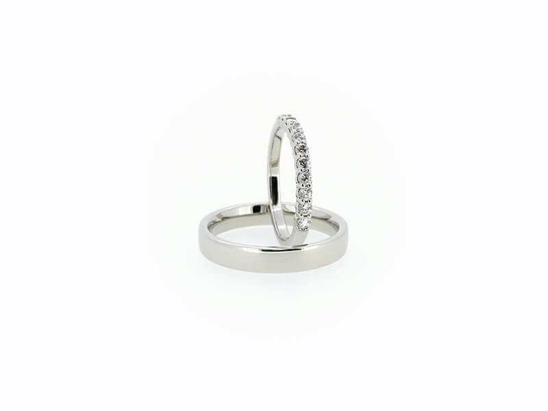 Pavyzdyje – balto blizgaus aukso, lygaus profilio žiedai su briliantais. Briliantai 0,72ct. RW VS. Aukso praba – 750. Žiedų plotis – 2,5 – 4,5mm. Žiedų svoris – 8,5gr.