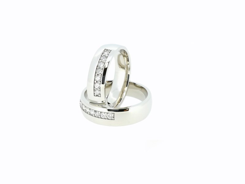 Pavyzdyje – žiedai balto blizgaus 585 prabos aukso. Forma – lengvai gaubta. Briliantai 0.3ct. RW VS. Žiedų svoris 14,2gr. Plotis 6mm.