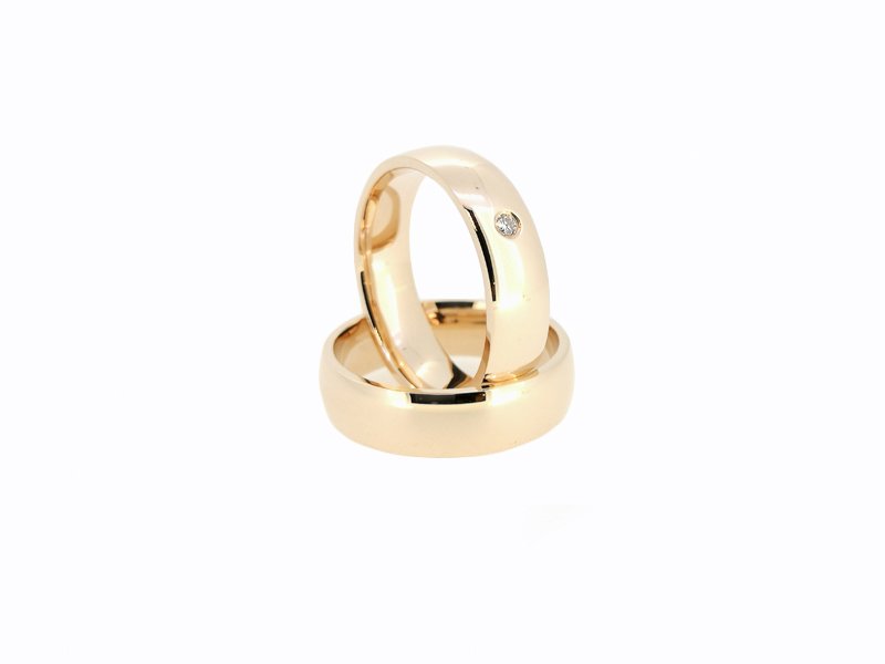 Pavyzdyje –  raudono 585 prabos aukso žiedai matiniu paviršiumi. Briliantas 0,03ct.RW SI. Žiedų svoris 14,5gr. Žiedų plotis 6mm.