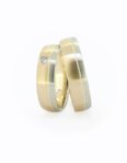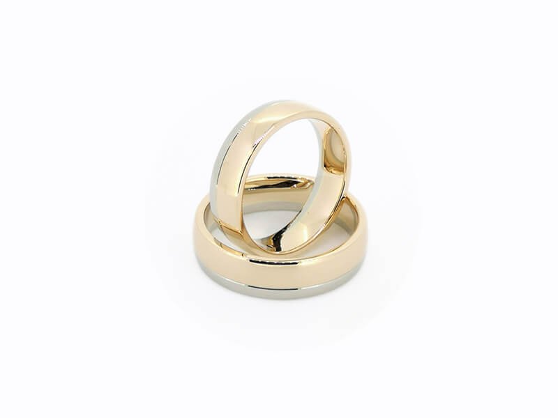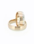 Pavyzdyje – rausvo ir balto aukso blizgaus paviršiaus vestuviniai žiedai. Praba 585. Žiedų plotis 6mm. Žiedų svoris 12,5gr.