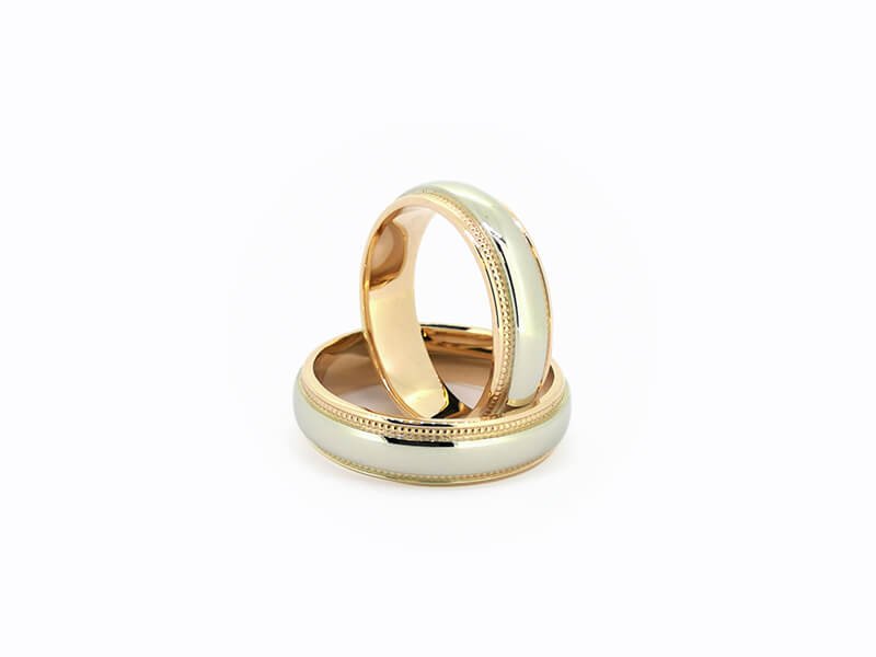 Pavyzdyje – rausvas ir baltas auksas su graviravimu. Praba 585. Žiedų svoris – 13gr.