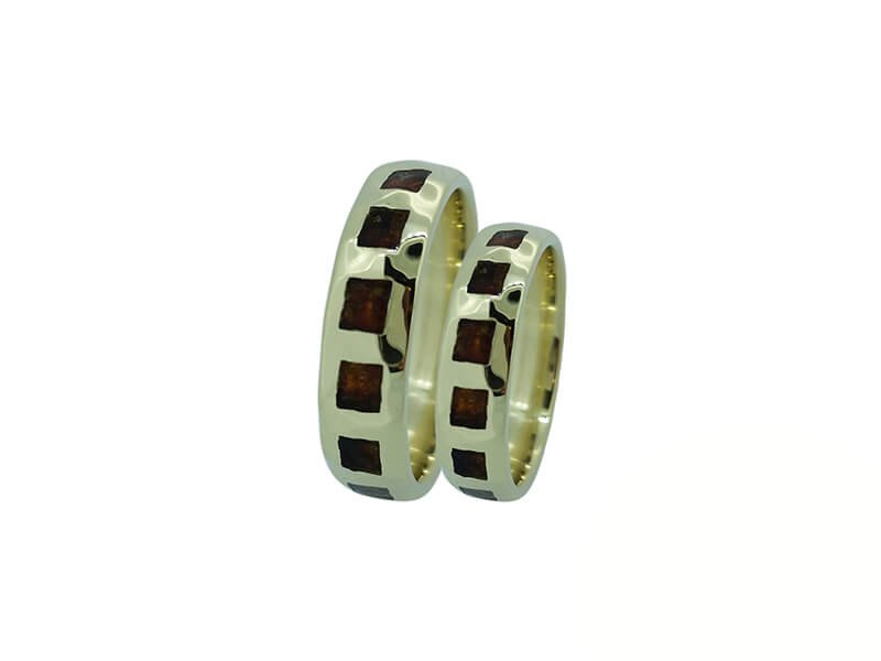 Žiedai gaminami tik pagal užsakymą. Pagaminimo terminas – 4-5 savaitės. Užsakymo metu galimas pasirinkimas: aukso praba- 585, 750; aukso spalva- rausva, gelsva, balta; žiedų pločiai. Žiedai prabuojami ir sertifikuojami. Pavyzdyje – gelsvo blizgaus 585 prabos aukso vestuviniai žiedai su gintarais. Žiedų plotis – 5-6mm. Žiedų svoris- 14gr. Kaina – 1250Eur.