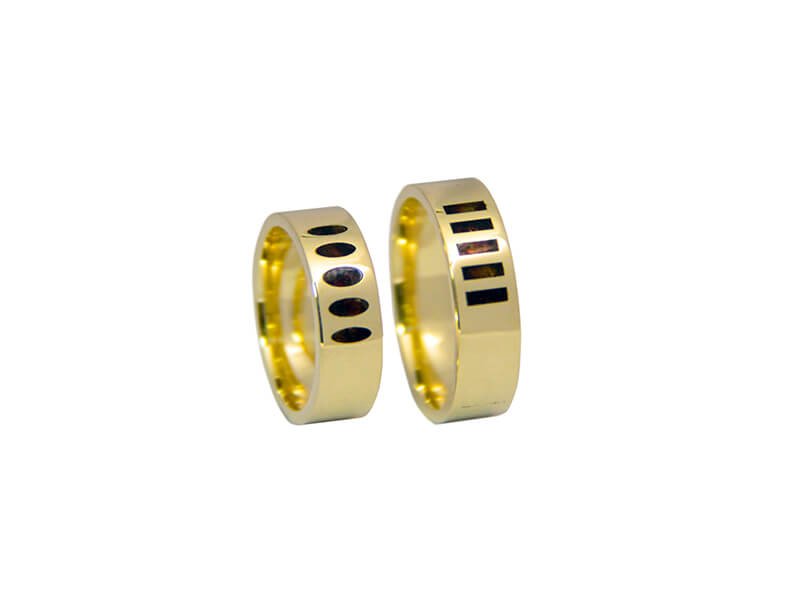 Žiedai gaminami tik pagal užsakymą. Pagaminimo terminas – 3-4 savaitės. Užsakymo metu galimas pasirinkimas: aukso praba – 585, 750; aukso spalva – balta, rausva, gelsva; žiedų pločiai. Žiedai prabuojami ir sertifikuojami. Pavyzdyje – gelsvo 585 prabos aukso vestuviniai žiedai su gintarais. Žiedų plotis – 5,5 -6mm. Svoris – 14gr. Kaina – 980Eur.
