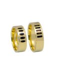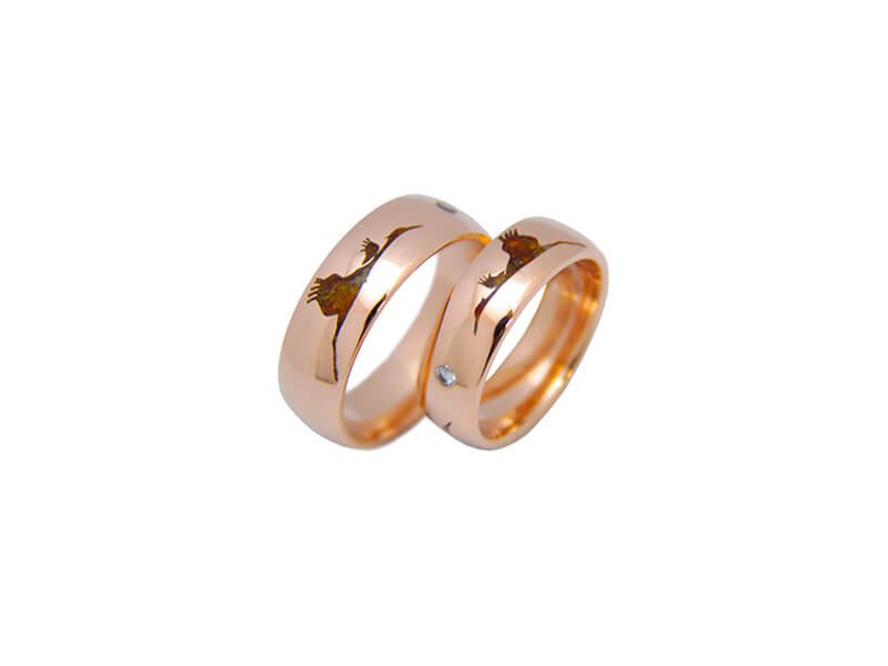 Žiedai gaminami tik pagal užsakymą. Pagaminimo terminas – 3 savaitės. Užsakymo metu galimas pasirinkimas: aukso praba – 585, 750; aukso spalva – balta, gelsva, rausva; žiedų pločiai. Žiedai prabuojami ir sertifikuojami. Pavyzdyje – rausvo 585 prabos aukso vestuviniai žiedai su gintarinėmis gervių inkrustacijomis. Žiedų pločiai 5,5mm. Svoris – 13gr. Kaina – 880Eur.
