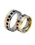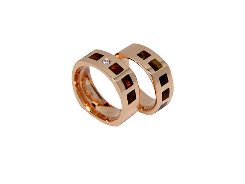 Žiedai gaminami tik pagal užsakymą. Pagaminimo terminas – 4-5 savaitės. Užsakymo metu galimas pasirinkimas: aukso praba -585,750; aukso spalva – balta, rausva, gelsva; žiedų pločiai.  Žiedai prabuojami ir sertifikuojami. Pavyzdyje – vestuviniai žiedai su gintarais rausvo 585 prabos aukso. Žiedų plotis 6,5mm. Svoris 16gr. Kaina 1350Eur.