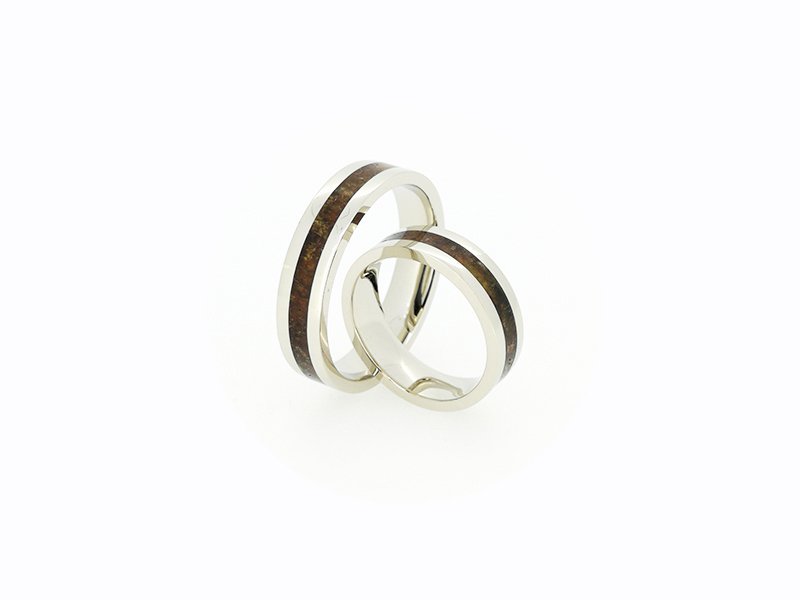 Žiedai gaminami tik pagal užsakymą. Pagaminimo terminas – 4-5 savaitės. Užsakymo metu galimas pasirinkimas: aukso praba – 585,750; aukso spalva – balta, rausva, gelsva, žiedų pločiai. Žiedai prabuojami ir sertifikuojami. Pavyzdyje – vestuviniai žiedai su gintarais 585 prabos balto aukso. Svoris 11,5gr. Plotis 4,5-5mm. Kaina 1150Eur.