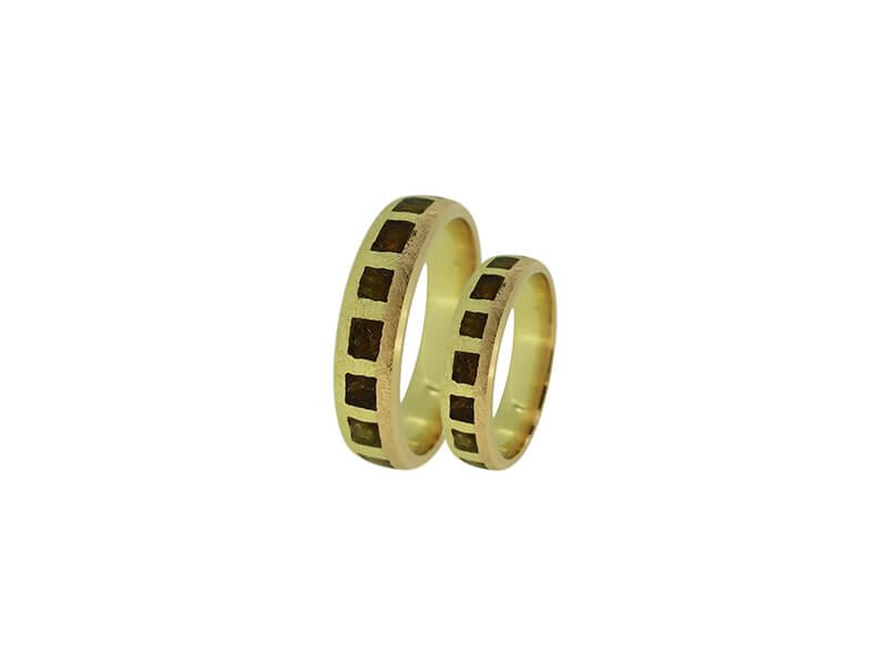 Žiedai gaminami tik pagal užsakymą.  Pagaminimo terminas – 4-5 savaitės. Užsakymo metu galimas pasirinkimas: aukso praba – 585, 750; aukso spalva – balta, rausva, gelsva; žiedų pločiai, formos.  Žiedai prabuojami ir sertifikuojami. Pavyzdyje – gelsvo 585 prabos aukso vestuviniai žiedai su gintarais. Žiedų plotis – 4,5 – 5 mm.  Žiedų svoris – 12,5gr.  Kaina – 1200Eur.