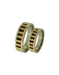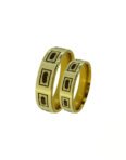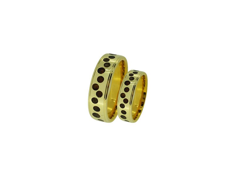 Žiedai gaminami tik pagal užsakymą. Pagaminimo terminas – 4-5 savaitės. Užsakymo metu galimas pasirinkimas: aukso praba – 585, 750; aukso spalva – balta, rausva, gelsva; žiedų plotis, forma. Žiedai prabuojami ir sertifikuojami. Pavyzdyje – gelsvo 585 prabos aukso vestuviniai žiedai su gintarais. Žiedų plotis – 4,5-5mm. Žiedų svoris – 12,5gr. Kaina – 1050Eur.